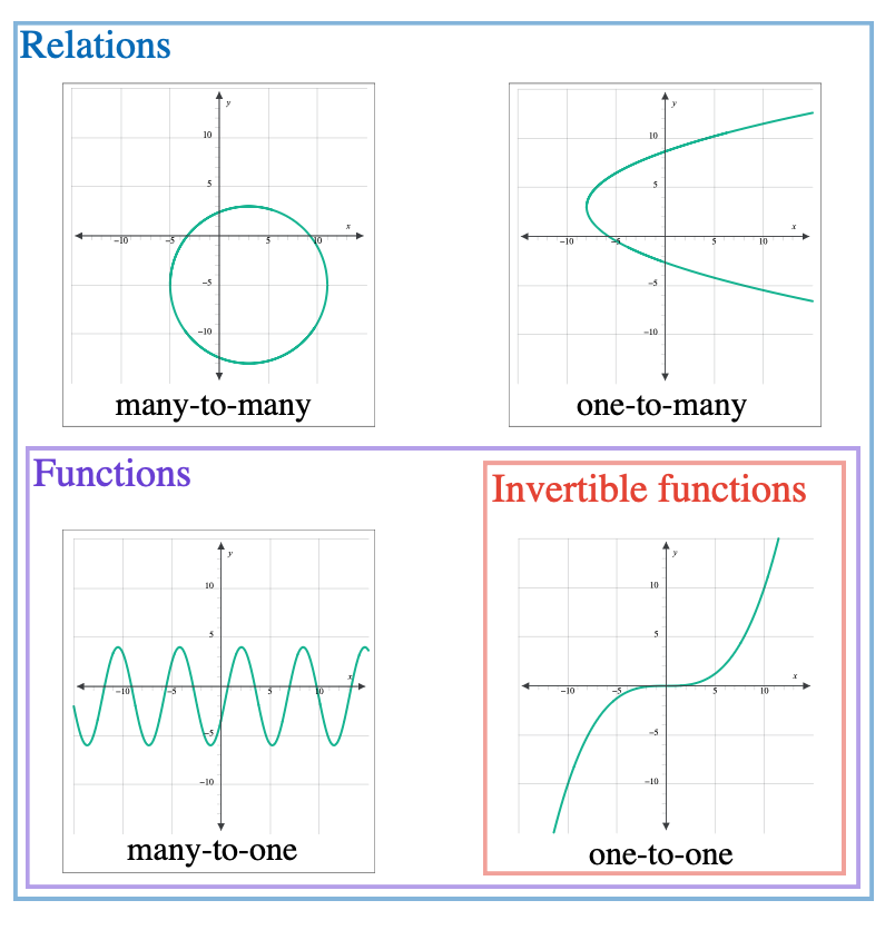 What does a one to one, many to one, one to many and many to many graph look like?