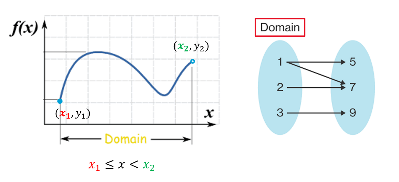 Domain is “all of the possible x-values” that a relation has. You can think of it as all the numbers you could put into the function machine.