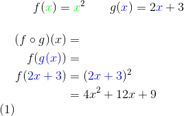 It can also be written as f(g(x)). This means you put the whole g(x) function inside the brackets of “f”. Then you use this as the argument for the “f” function.