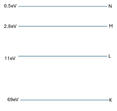 Using the diagram, how much energy is released when an electron moves from L–>K?