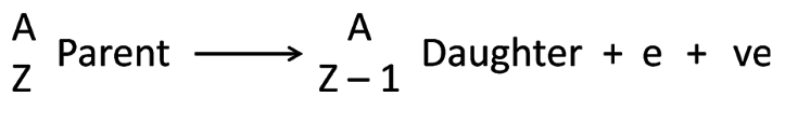 too few neutrons. The extra proton decays into a neutron (which is retained in the nucleus), a positron (β+ or e) and an electron neutrino (ve). A neutron is gained, and a proton is lost meaning the mass number remains equal but the atomic number decreases by 1. This form of radioactivity, with the production of a positron, is important in PET imaging. The emitted positron travels only a minimal distance before it undergoes an annihilation reaction with the production of two 0.511 MeV photons that travel in opposite directions to one another.