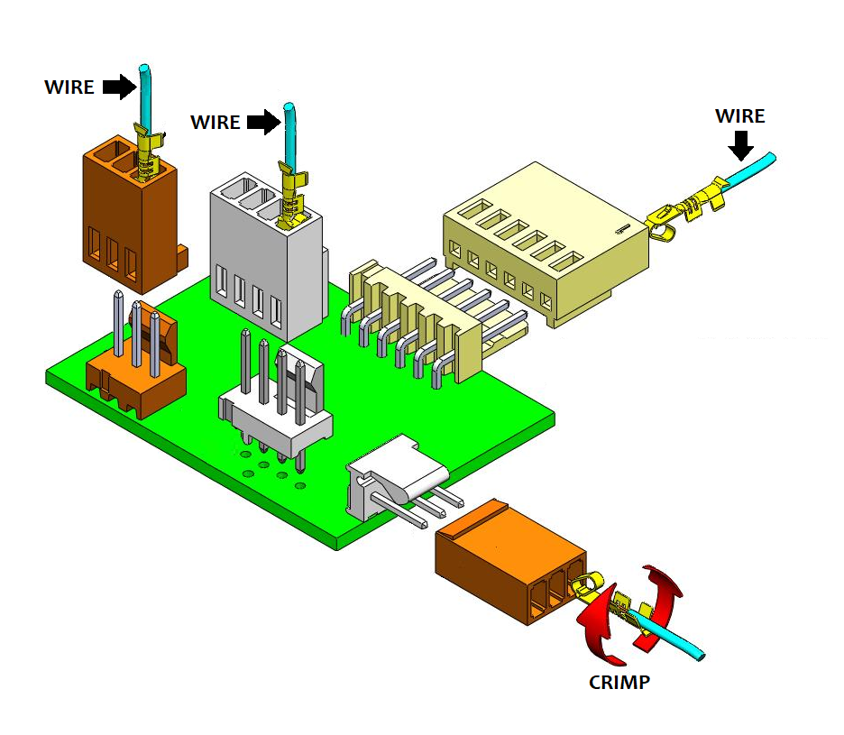 Wafers are similar to standard Pin Headers, but the female is crimped to a wire cable for a wire-to-board connection. Sold as 3 pieces: Wafer, Wafer Housing, Crimp Terminal