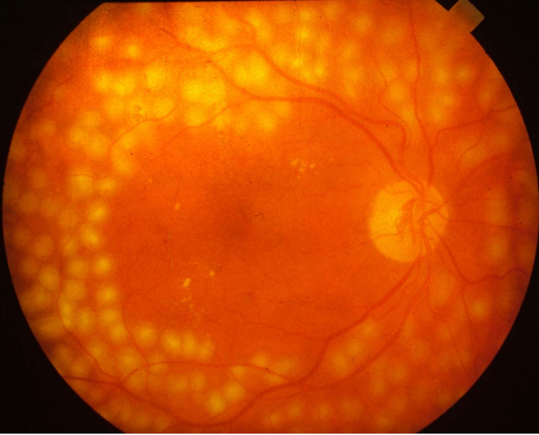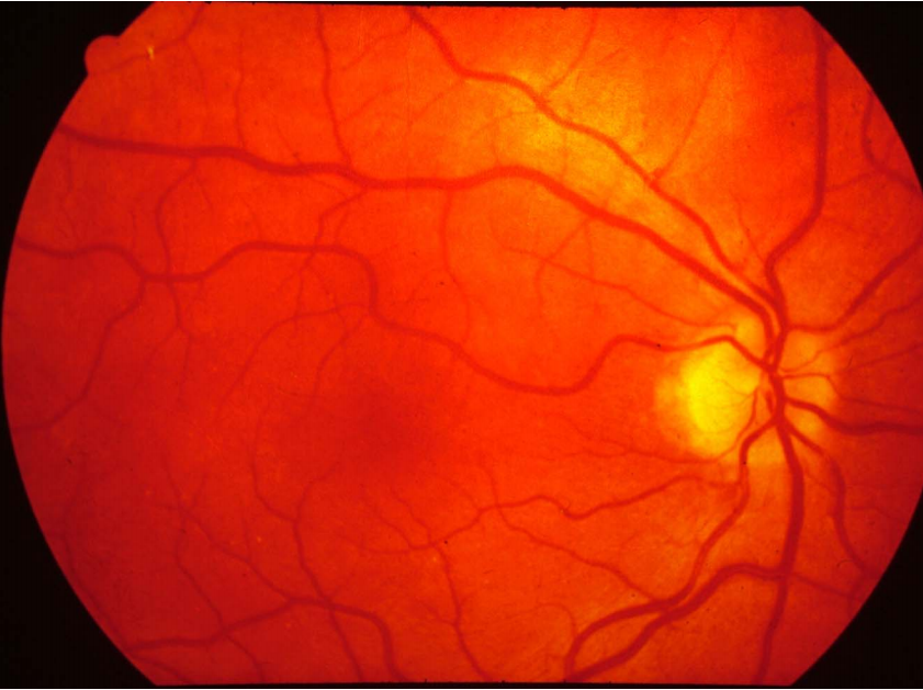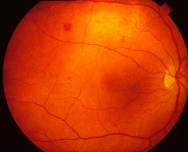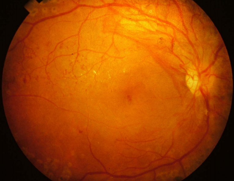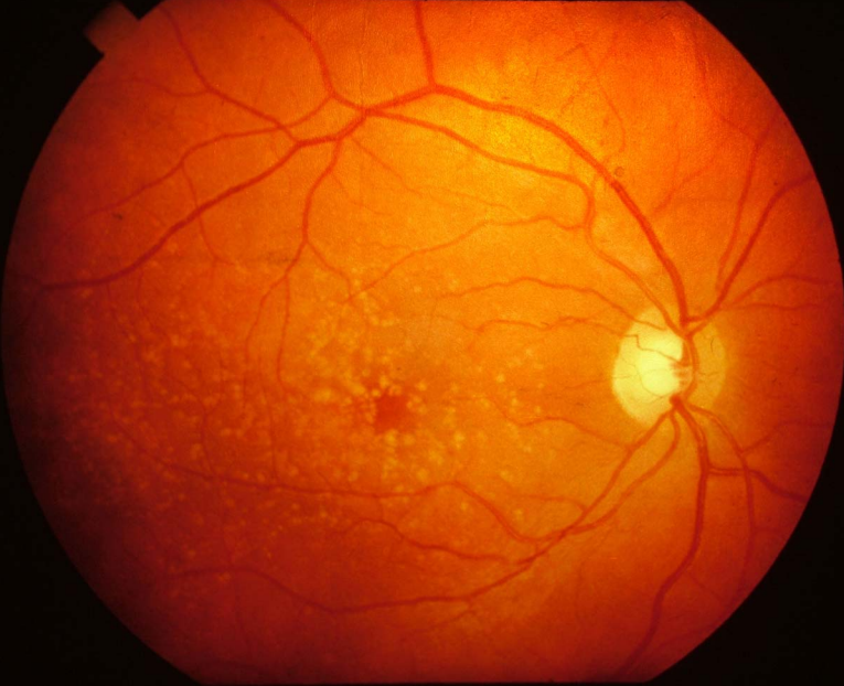 Senile macula degeneration. The disc appears normal but there is unusual pigmentation at the macula. This patient also has drusen which are asymptomatic nodules occurring in the choroid.