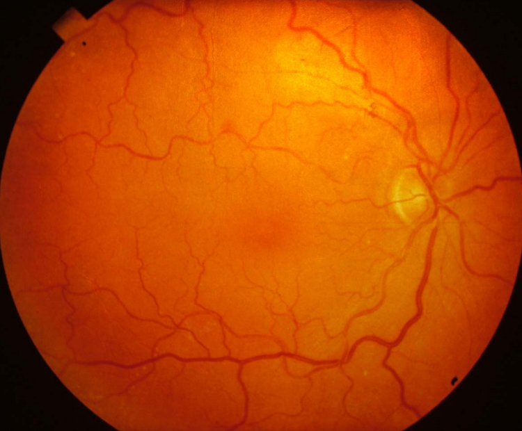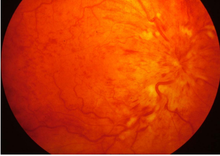 Hypertensive retinopathy. The retinal arteries have become narrow and tortuous. In more advanced cases haemorrhages and ‘star burst’ exudates occur together with papilloedema.