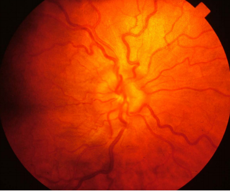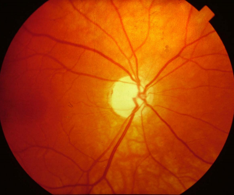 Disc cupping. Here the degree of cupping is mild but suggestive of glaucoma. As the condition progresses the optic disc becomes pale and the cup wider and deeper.