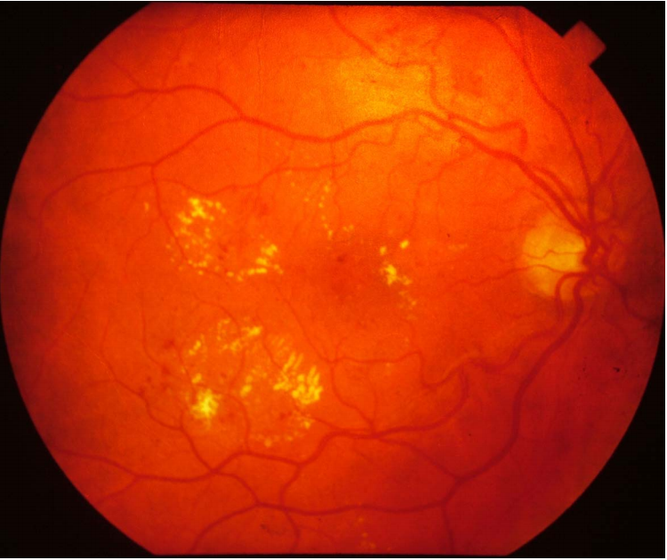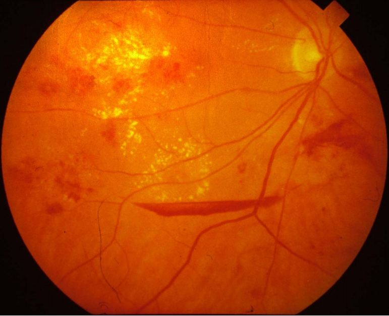 Background diabetic retinopathy. There are areas of hard exudates and some evidence of macula involvement.