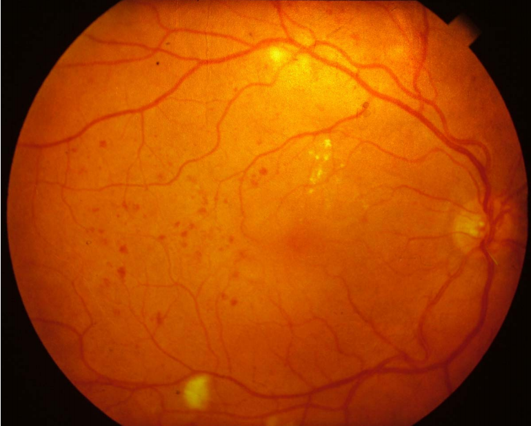 Mild background diabetic retinopathy. Haemorrhages and microaneurysms can be seen.