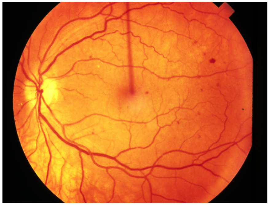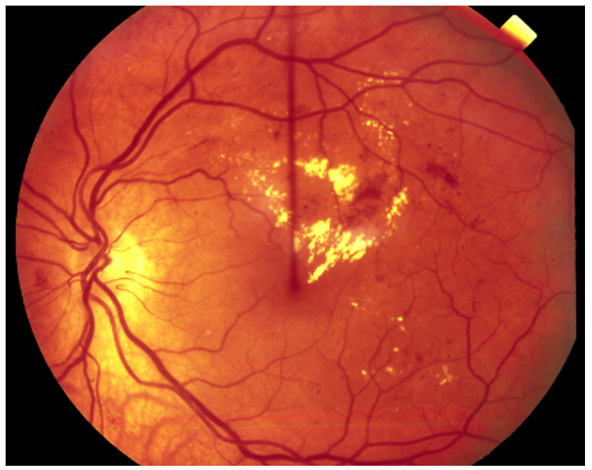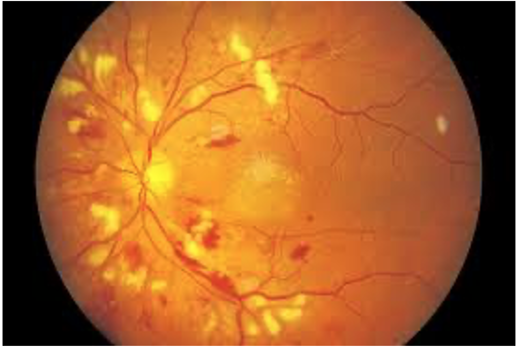 Lesions: Hard exudates, ?microaneurysms, haemorrhages