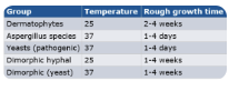 What are the growth times and temperatures for different fungal groups?