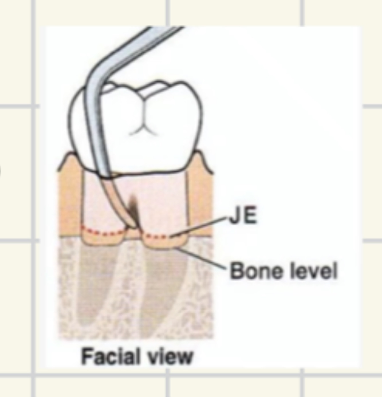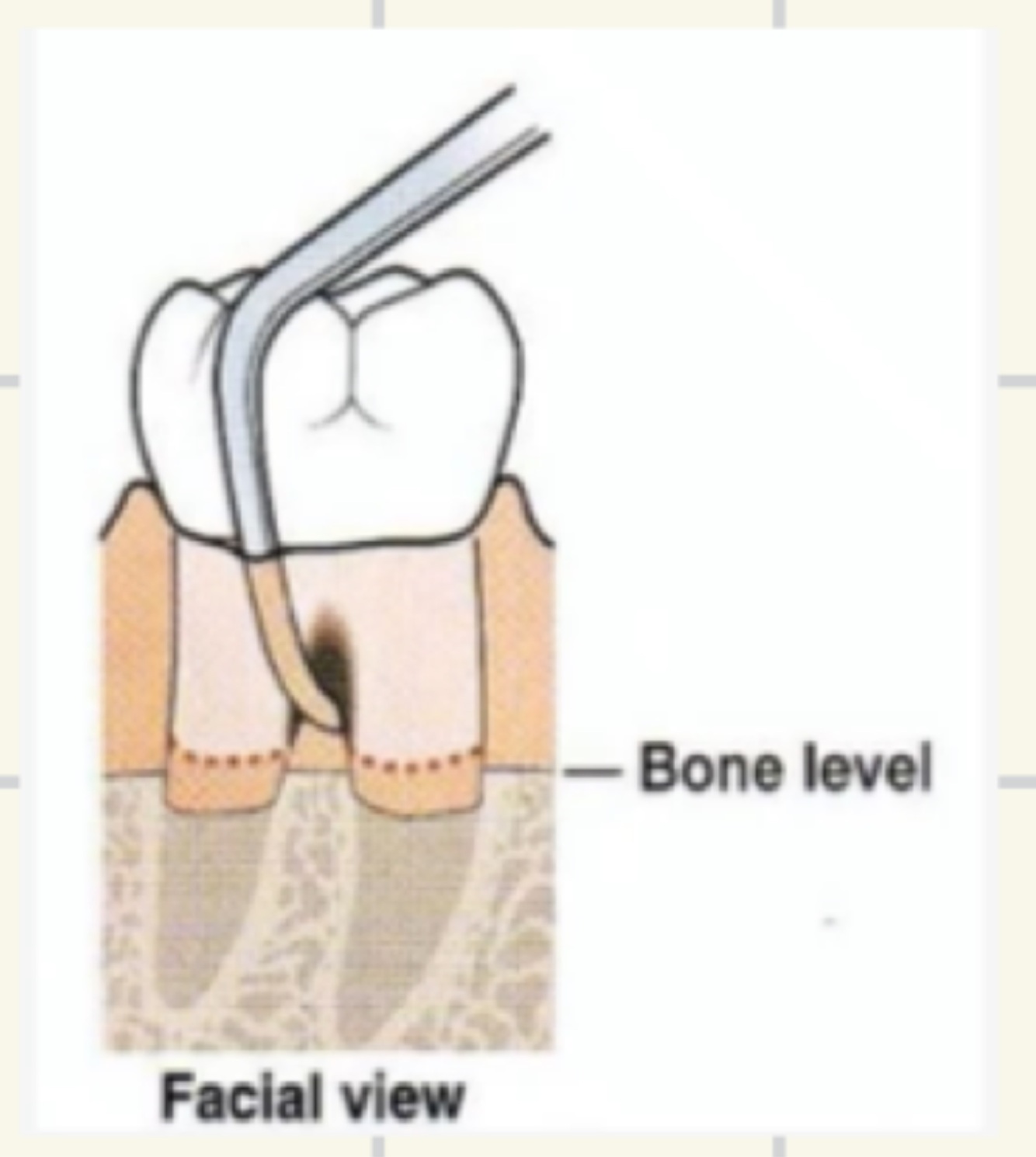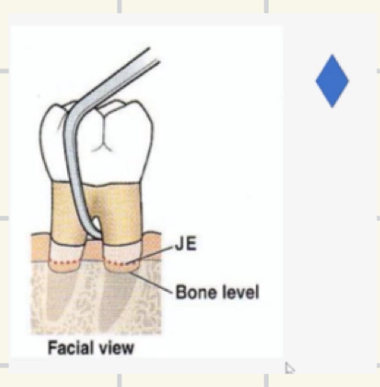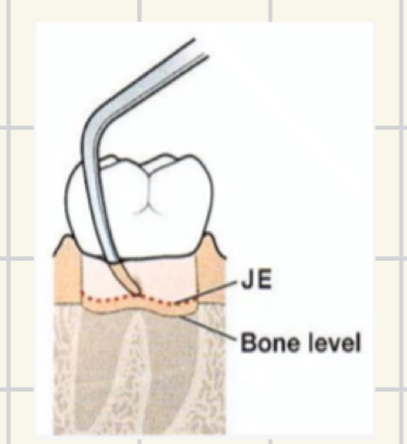 Bone is destroyed, probe gets into furcation but doesn’t come out the other side, cannot see it