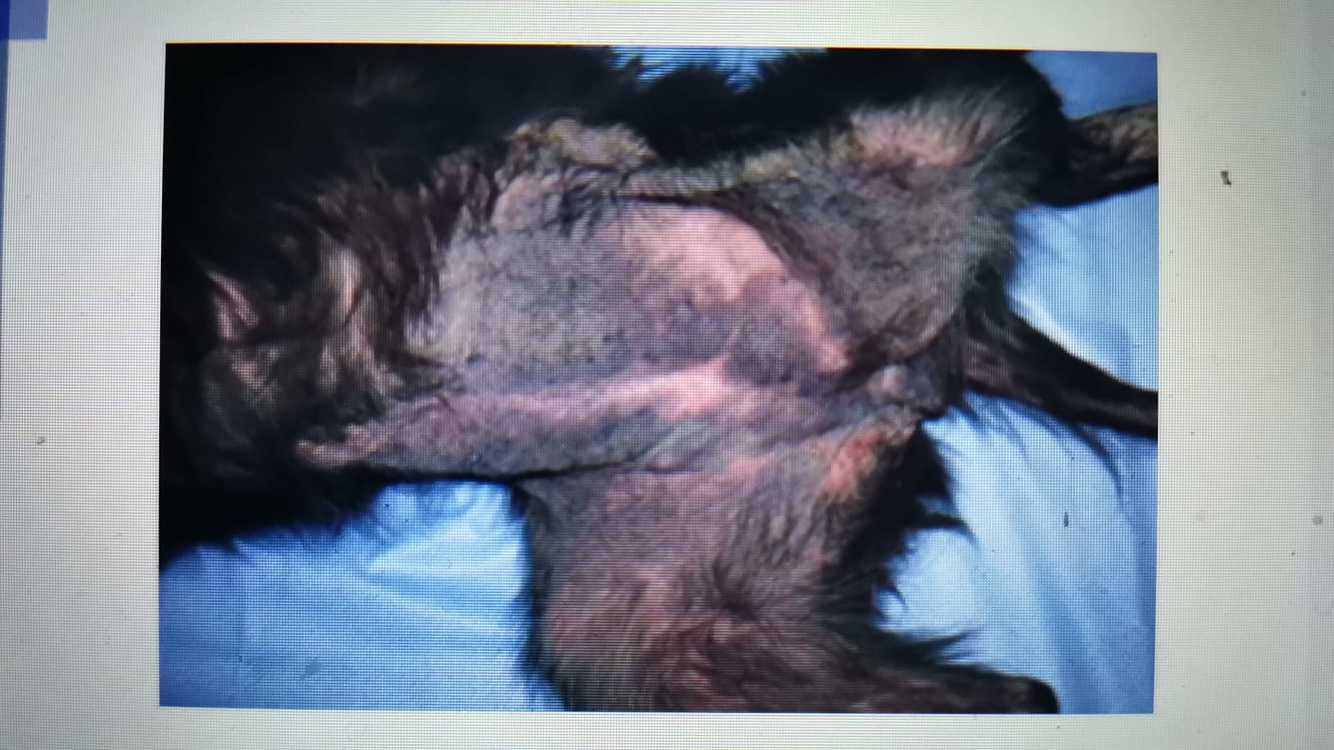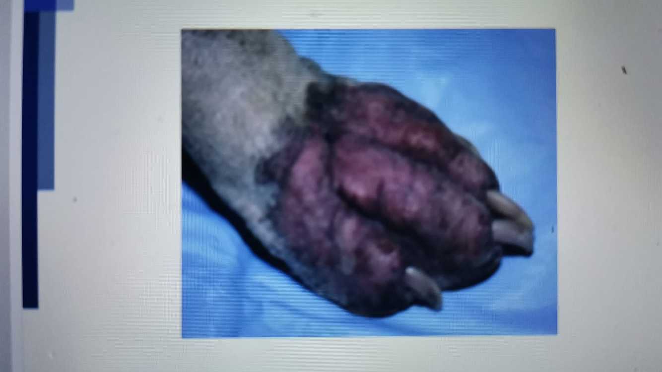 Sharpei mit Erythem und Allopezie an distalen Gliedmassen; wie bei Umweltallergie bei Futterallergie oft Pfoten betroffen