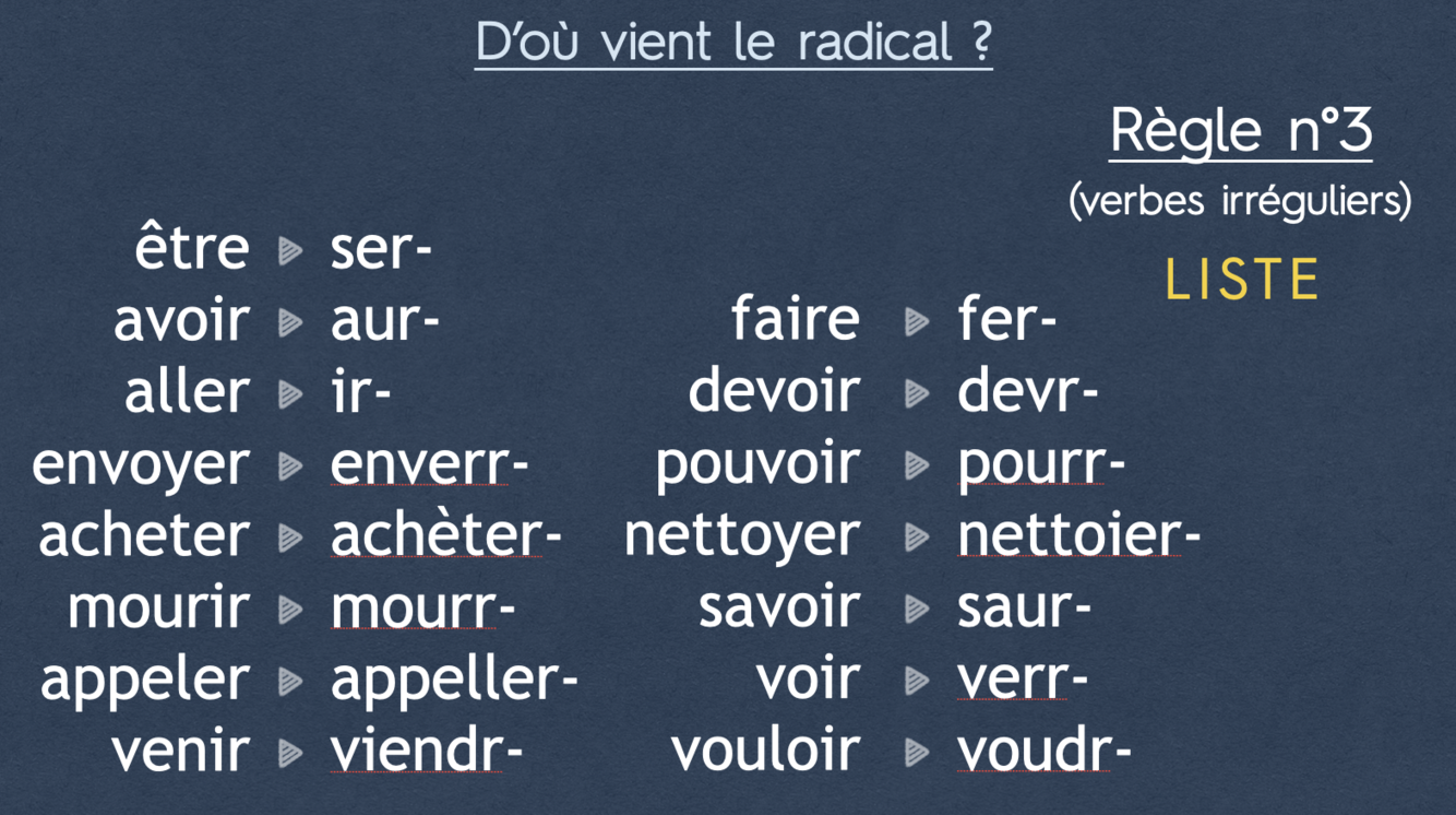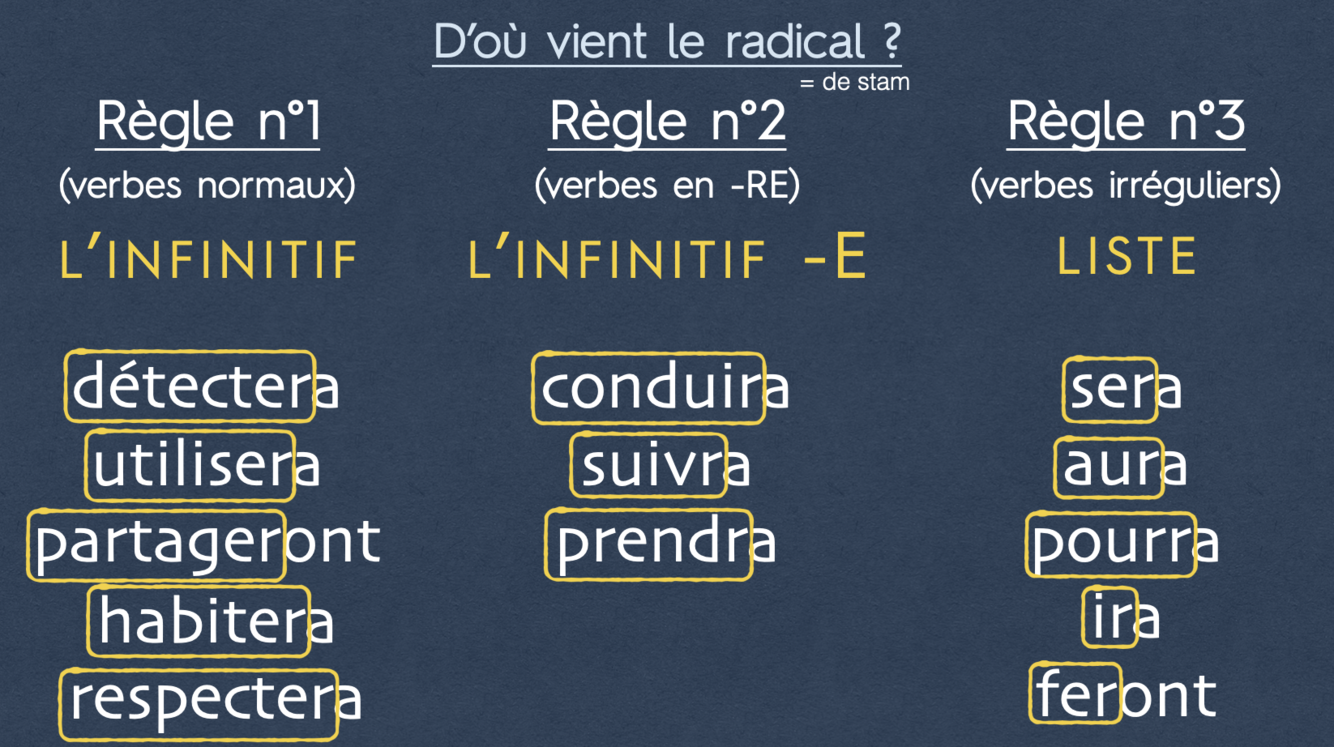 Waar komt de stam (het begin) van een werkwoord in de “futur simple” vandaan?