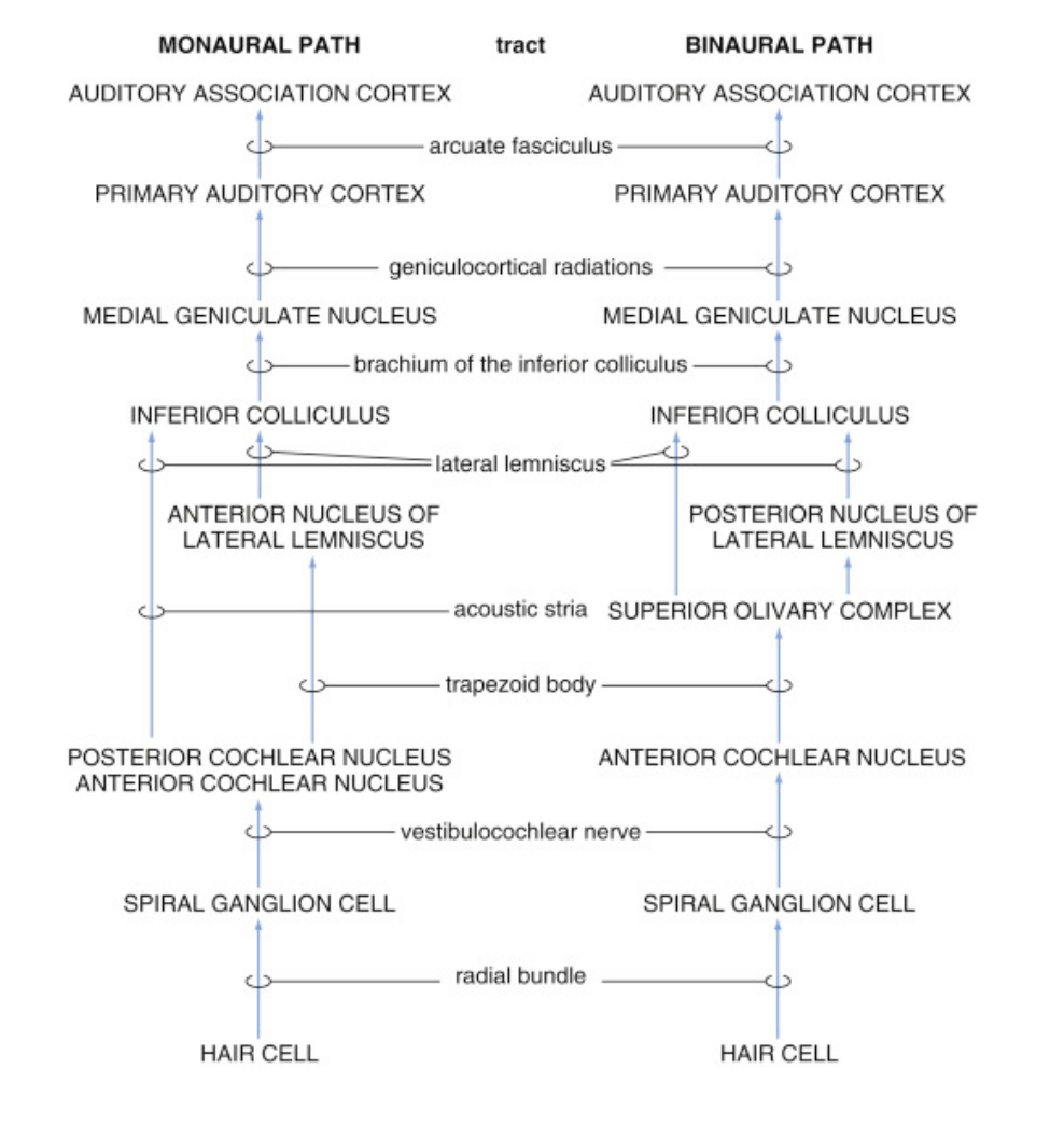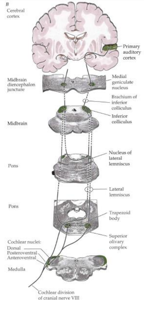 Ventral cochlear nuclei –>bilateral to trapezoid body –> superior olivary complex –> lateral leminiscus –> brachium of inferior colliculus –> medial geniculate nucleus –> layer 4 of primary auditory cortex (Heschl’s gyrus)