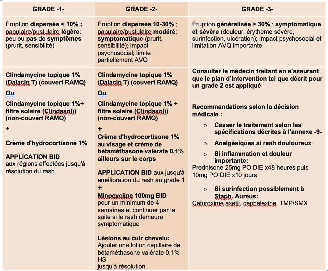 Cette toxicité cutanée apparaît habituellement dans les 7 à 14 jours suivant l’instauration du traitement et atteint une intensité maximale après 3 à 5 semaines de thérapie. Le rash disparait généralement dans les 4 semaines suivant l’arrêt du traitement