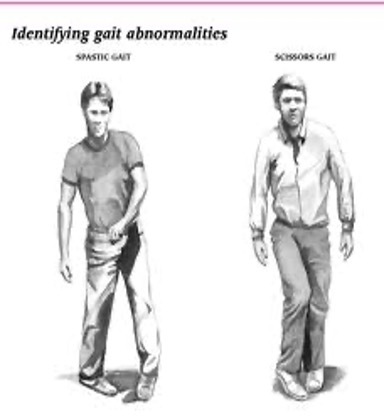 The patient’s legs flex slightly at the hips and knees, so he looks as if he’s crouching. With each step, his thighs adduct, and his knees hit or cross in a scissors like movement.