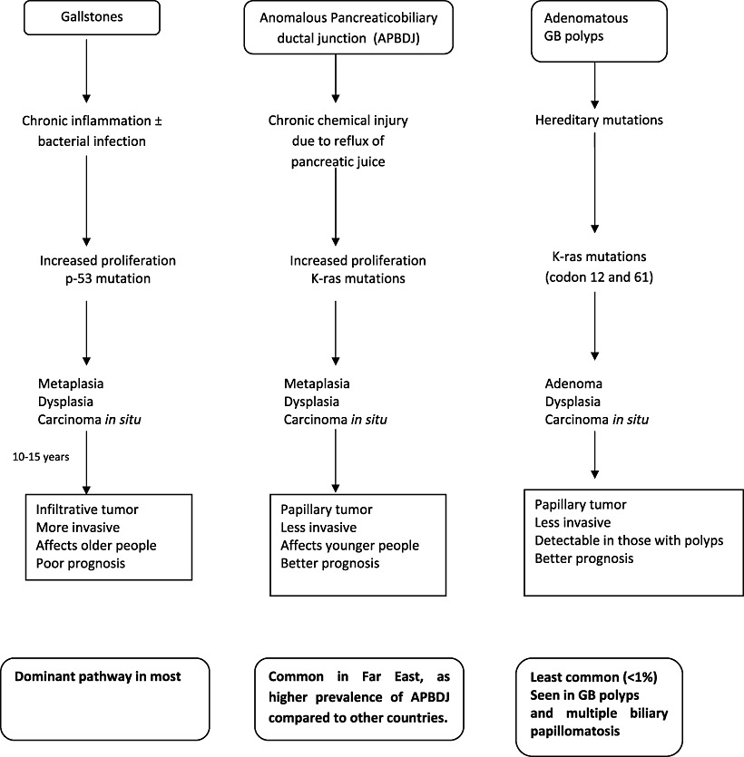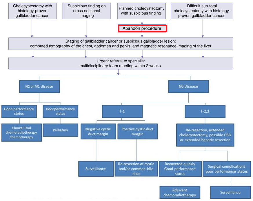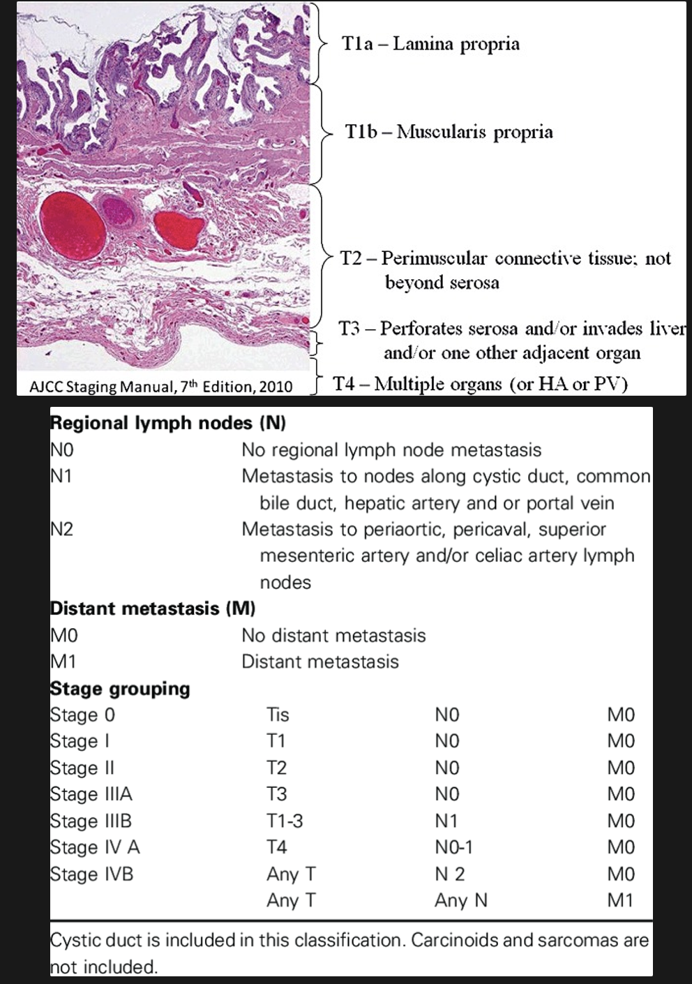 - Direct invasion to liver (segment IVB and V), colon, duodenum, cystic duct, CBD