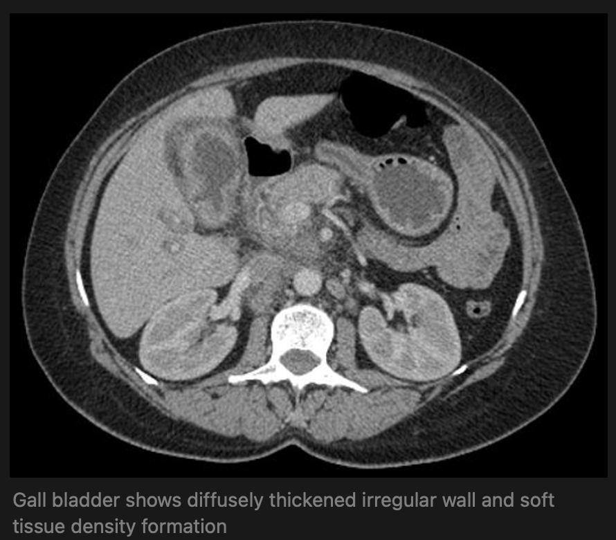 CT Scan - appear as large heterogeneous masses, which may have engulfed gallstones or areas of necrosis, patchy moderate contrast enhancement is usually seen.