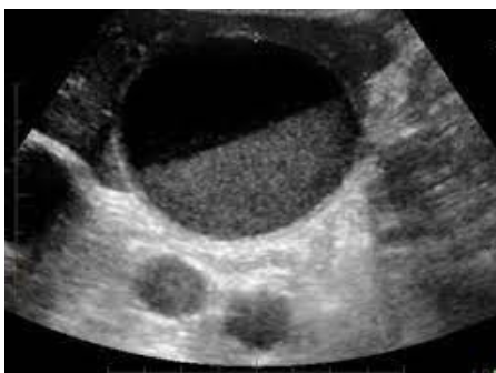 Choledochal cyst - Sonolucent mass, may contain internal sludge