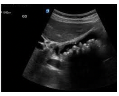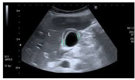 Acute Choleycystitis - Thickened gallbladder wall >3 mm, irregular outline of thickened wall, sonolucent