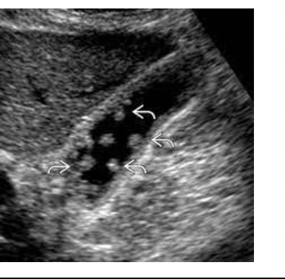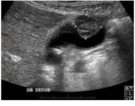 Cholelithiasis/Gallstones - Increased wall thickness, internal reflections, mobile, hyperechoic