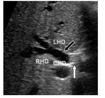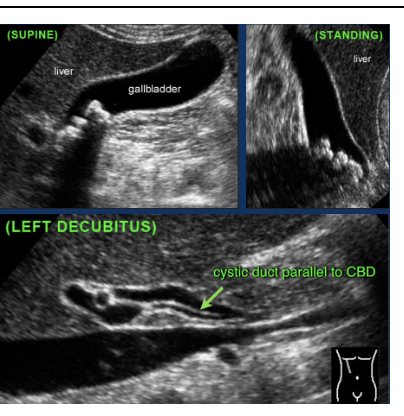 Choledocholithiasis - Stones impacted, dilated ducts, hyperechoic stone, posterior shadow
