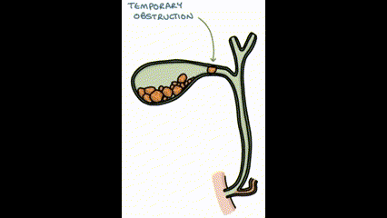 Stones temporarily obstruct gallbladder drainage, lodged at neck of gallbladder or in cystic duct, falls back into gallbladder relieving symptoms