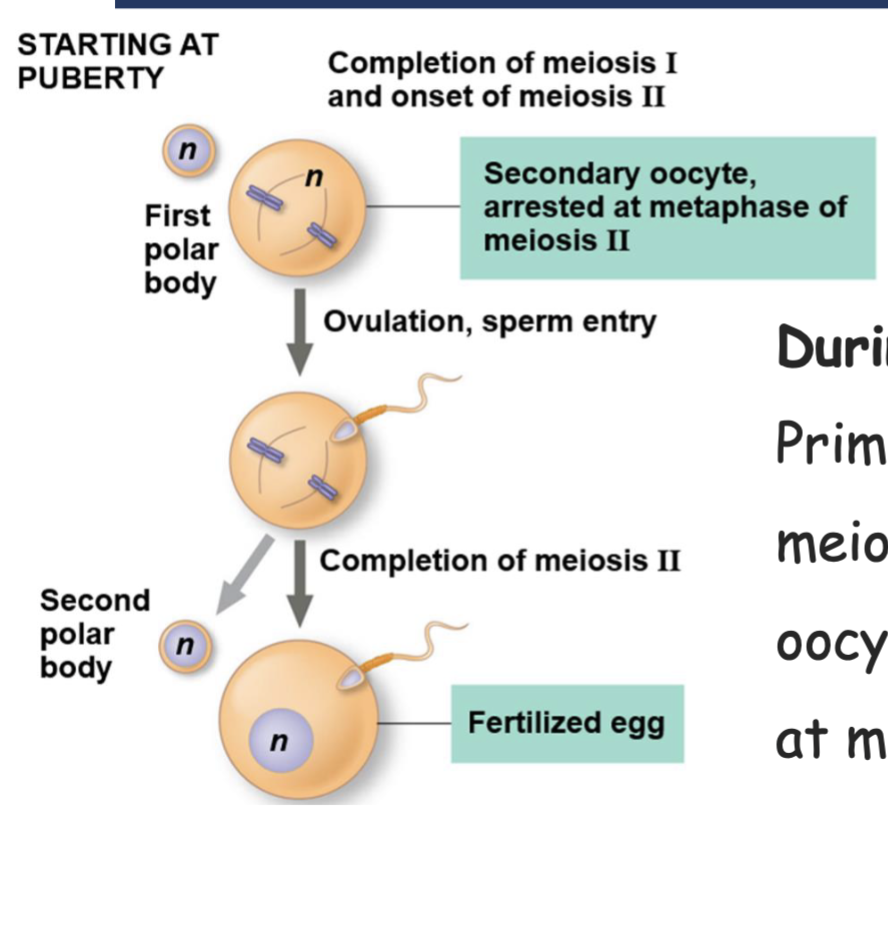 During puberty the Primary Oocyte divide via meiosis to form secondary oocyte which get arrested at metaphase II