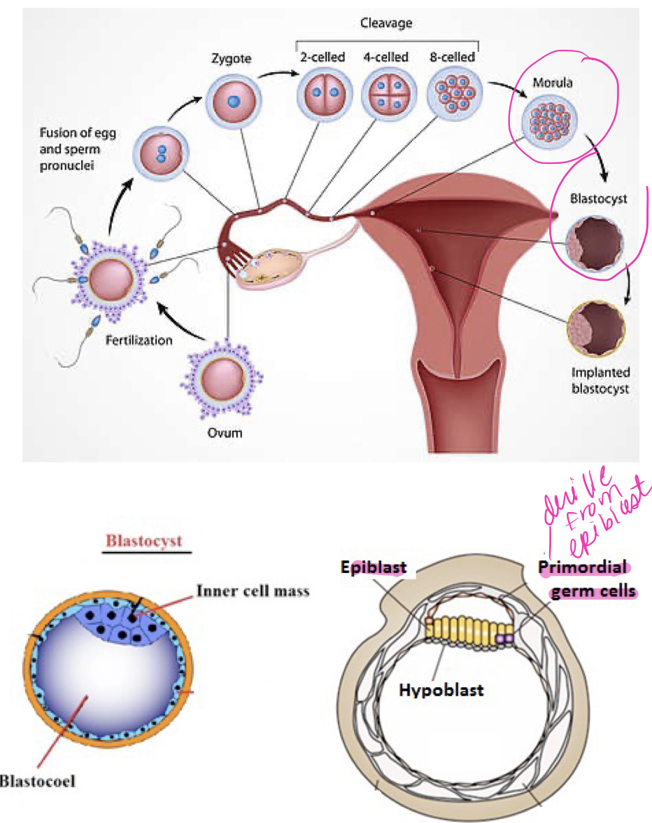 In regards to the origin of germ cells. A sperm will fertilize the ovum in the fallopian tube and form the zygote.