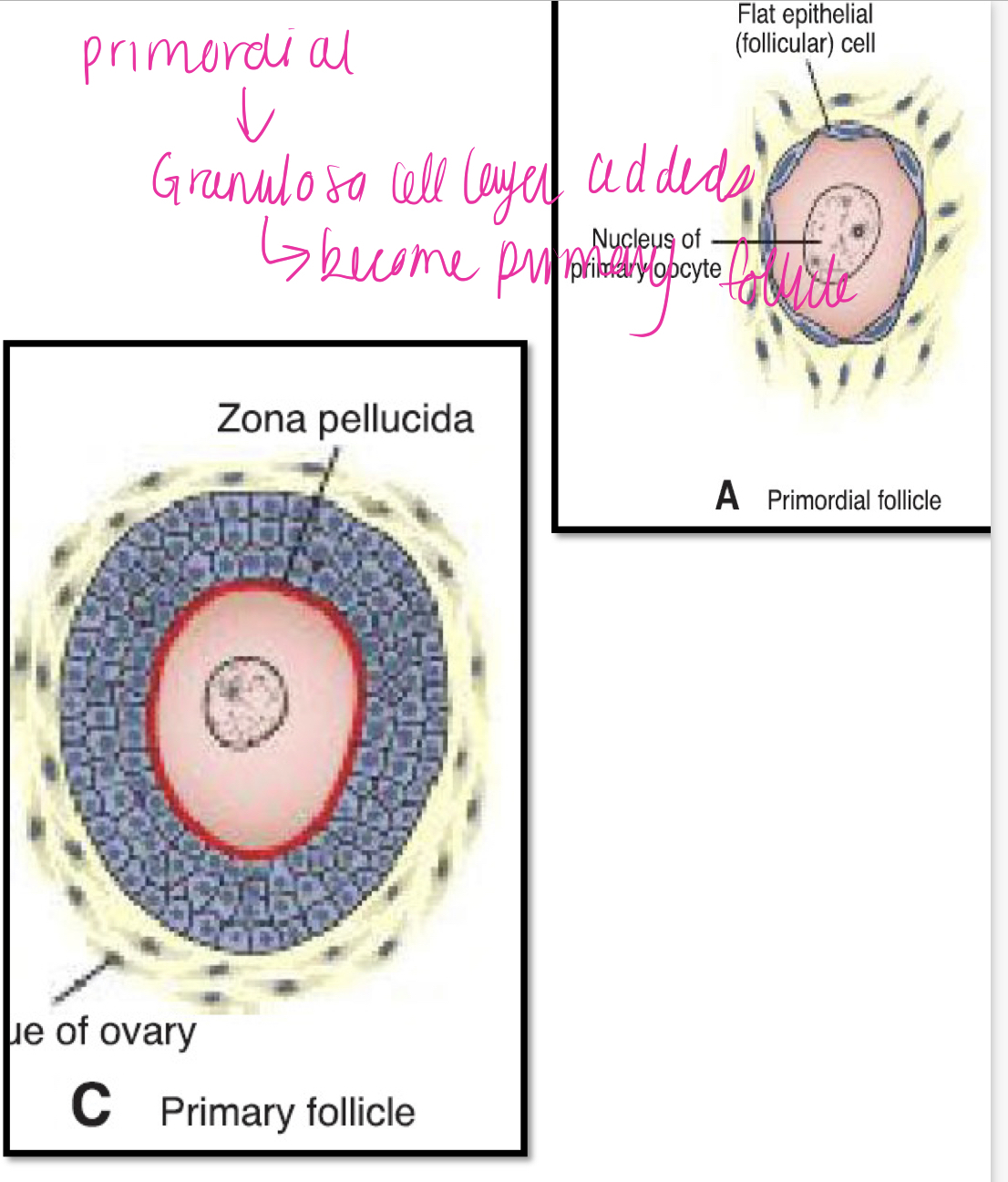 A primary oocyte, together with its surrounding flat epithelial cells is known as a primordial follicle. Follicular cells change from flat to cuboidal and form many layers of granulosa cells, and the unit is called primary follicule. Granulosa cells are surrounded by ovarian connective tissue, the _______. Granulosa cells and oocyte secrete a layer of glycoproteins on the surface of the oocyte forming the _______.