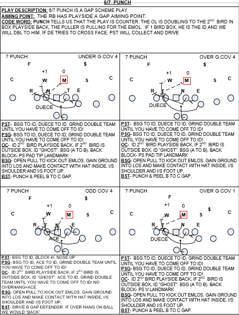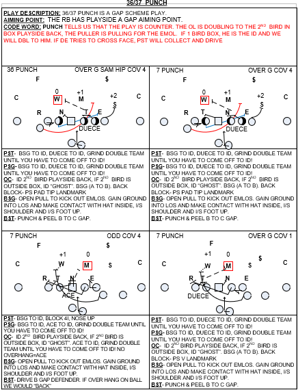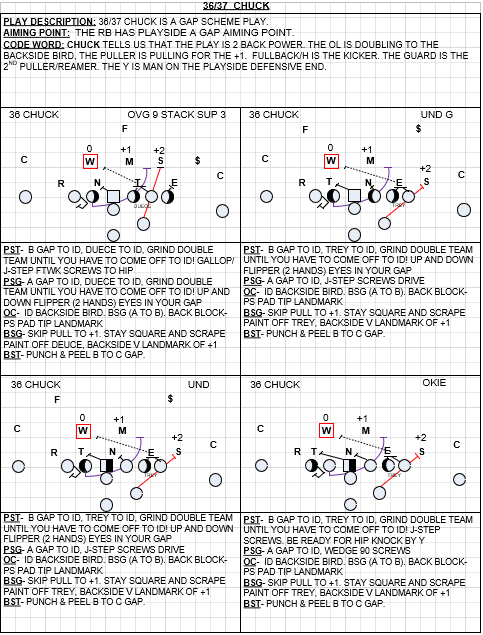 TELLS US THAT THE PLAY IS 2 BACK POWER. THE OL IS DOUBLING TO THE BACKSIDE BIRD, THE PULLER IS PULLING FOR THE +1. FULLBACK/H IS THE KICKER. THE GUARD IS THE PULLER/REAMER. THE Y IS MAN ON THE PLAYSIDE DEFENSIVE END
