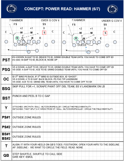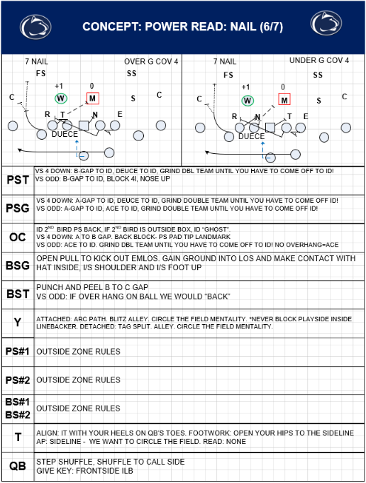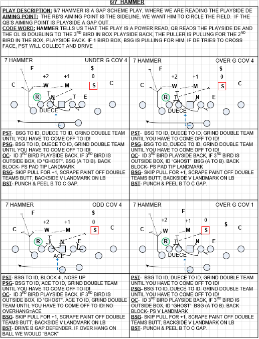 TELLS US THAT THE PLAY IS A POWER READ, QB READS THE PLAYSIDE DE AND THE OL IS DOUBLING TO THE 3RD BIRD IN BOX PLAYSIDE BACK, THE PULLER IS PULLING FOR THE 2ND BIRD IN THE BOX, PLAYSIDE BACK. IF 1 BIRD BOX, BSG IS PULLING FOR HIM. IF DE TRIES TO CROSS FACE, PST WILL COLLECT AND DRIVE