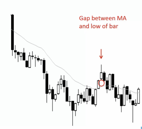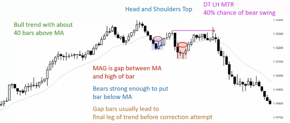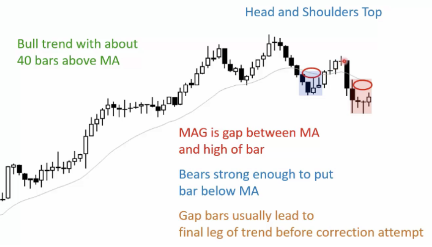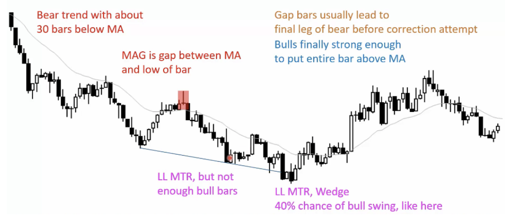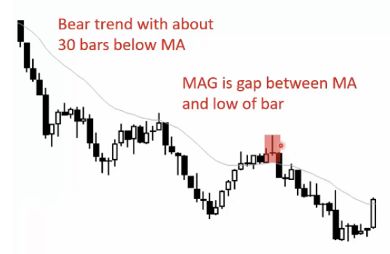 Bear Trend with about 30 bars below MA, MAG gap between MA and low of bar