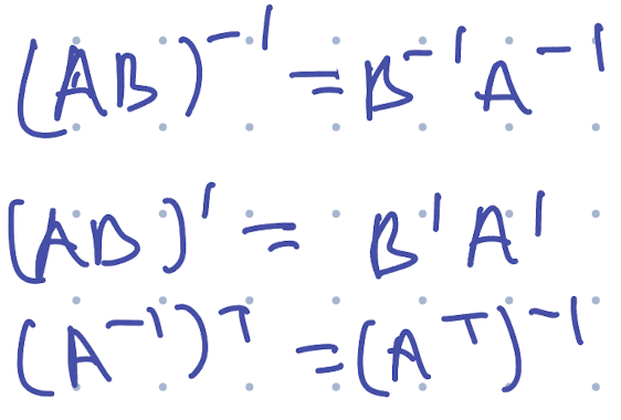 Give the formulas for 1. AB inverse 2. AB transpose and 3. A inverse transpose