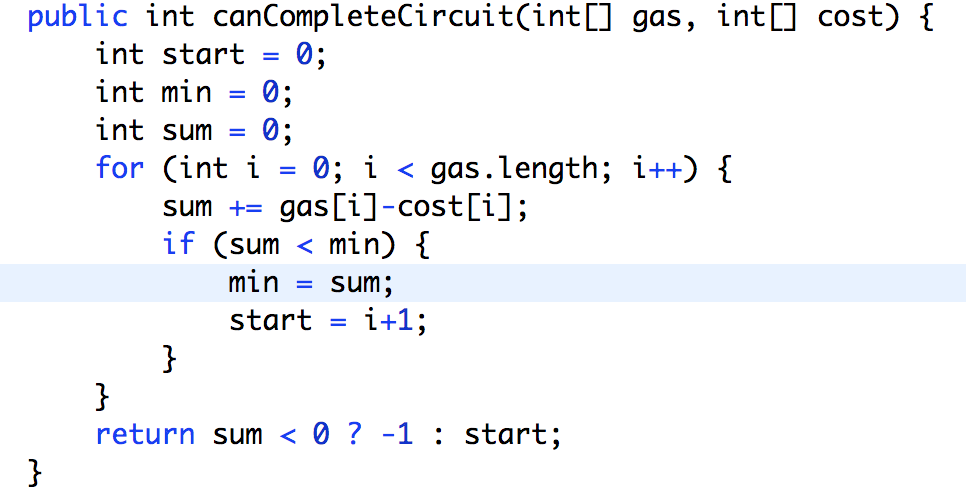 You have a car with an unlimited gas tank and it costs cost[i] of gas to travel from station i to its next station (i+1). You begin the journey with an empty tank at one of the gas stations.