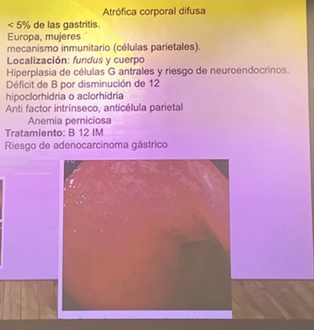 Gastritis crónica atrófica multifocal. Se caracteriza por un infiltrado inflamatorio difuso con atrofia glandular y metaplasia intestinal. Se afecta el cuerpo y el antro. Asocia hipoclorhidria.