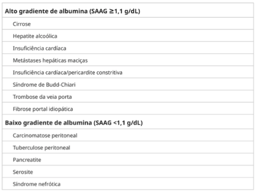 * cirrose: GASA > 1,1 (albumina sérica - ascitica)