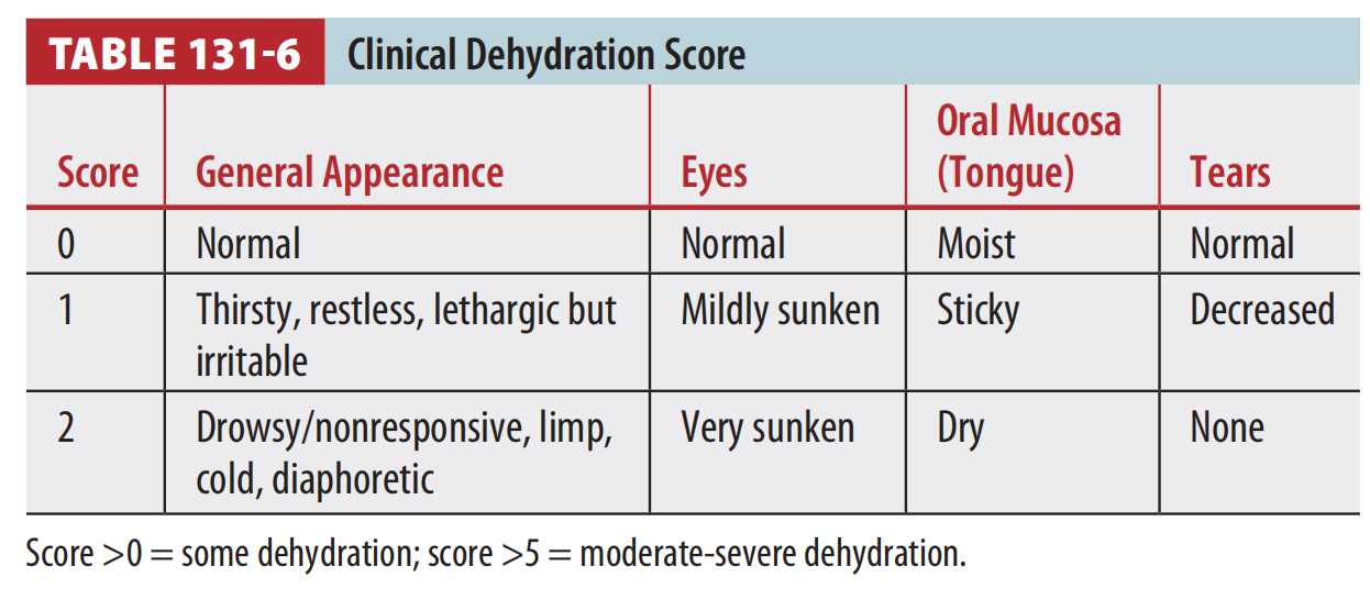 Clinical dehydration score, which correlates with length of stay and need for IV rehydration