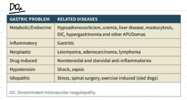 DDx. is parvoviral enteritis and increased gastric acid secretion (e.g. with gastrinoma).