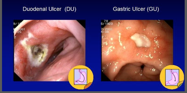 Defects in gastric/duodenal mucosa which extends through muscularis mucosa