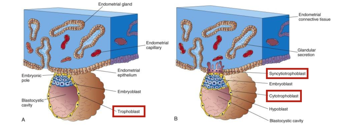 Describe implantation and trophoblast differentiation, and when they occur: