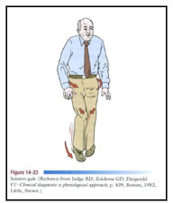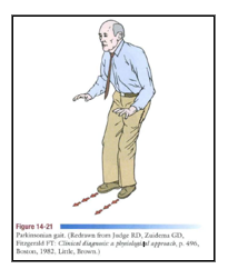 The neck, trunk, and knees of a patient are flexed. There is also a SHUFFLING or rapid short steps. Arms are held stiffly and the patient may lean forward and walk progressively faster as though unable to stop (Festinating)