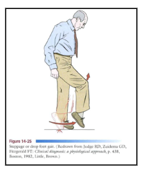 Results from weak or paralyzed dorsiflexor muscles. To avoid dragging the toes against the ground, the patient lifts the knee higher than normal. Initial contact, the foot SLAPS on the ground.