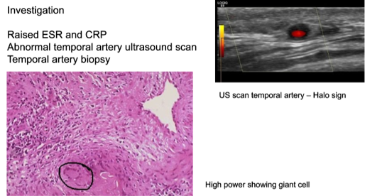 temporal artery biopsy - giant cells. Granulomatous. Within 48 h of starting corticosteroids. - negative biopsy does not exclude the diagnosis, because skip lesions occur.