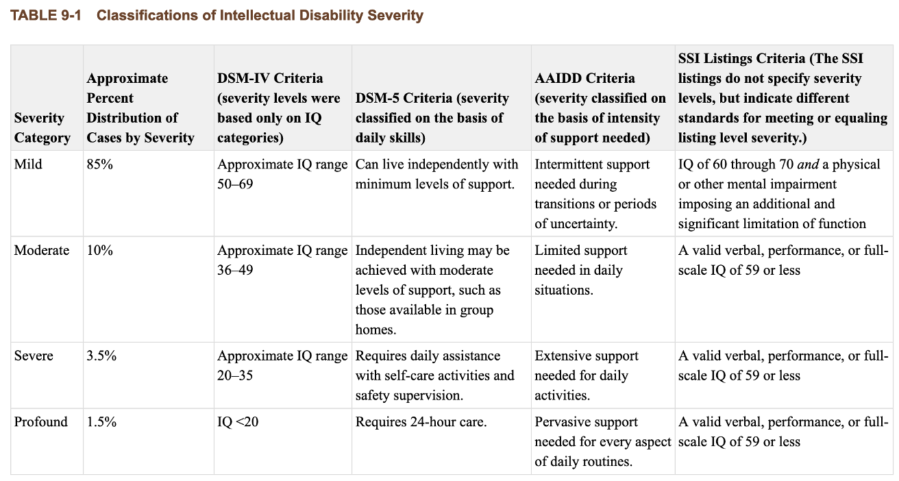 o Deficit in adaptive functioning (limits in one or more activities of daily life: communication, social participation, independent living, across multiple environments) to the extend sufficient for ongoing support
