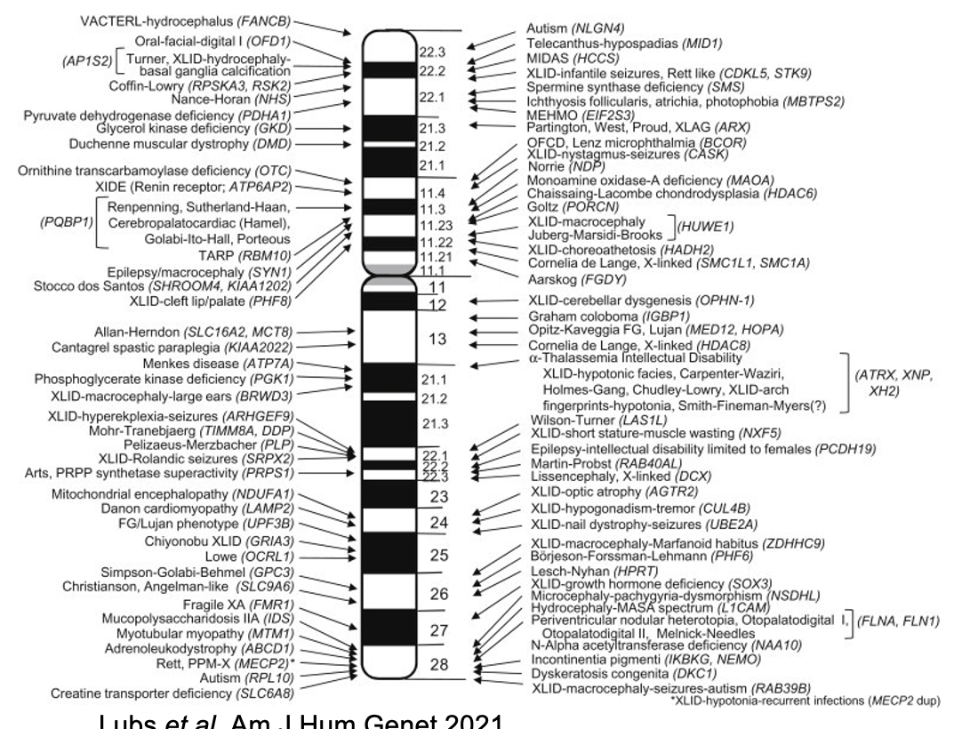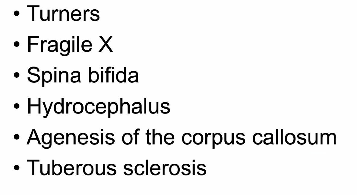Fragile X (FMR1 gene with repeats), Rett syndrome (MECP2), Tuberous sclerosis (TSC1/2)