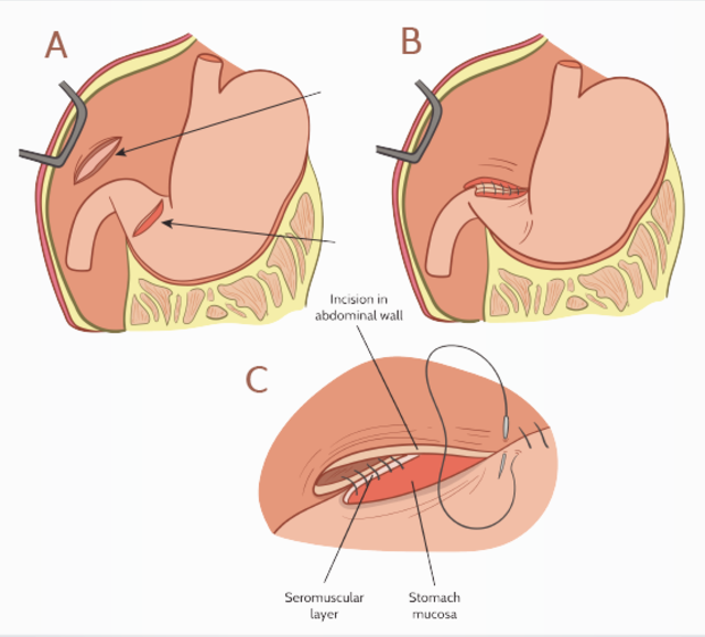 Incisional gastropexy - A 3–4 cm incision is made in the stomach, and then sutured to a similar incision in the right abdominal wall.