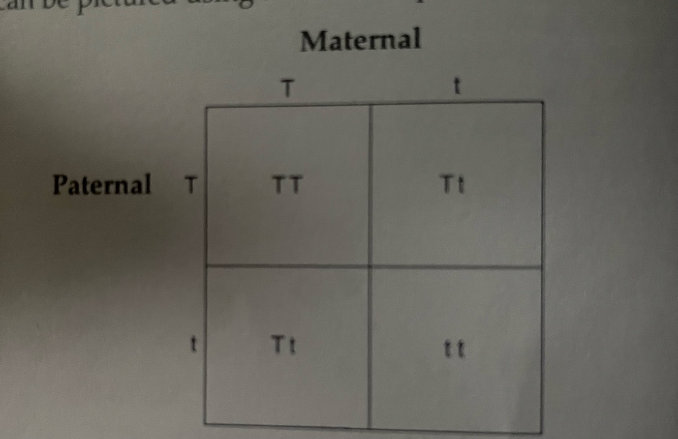 -In the genes produced by these individuals, half of the gametes are dominant (T) and half recessive (t) -arranging them on the Punnet square, we see the 25% of the offspring have a genotype of dominant dominant (TT), 50% dominant recessive (Tt) and 25% recessive recessive (tt).