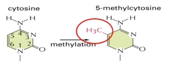 addition of methyl group to cytosine to the fifth carbon of the pyrimidine ring → ie cytosine turns into 5-methyl-cytosine