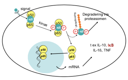NFkB består av p50 + p65 som hålls ihop av I-kB (vilket är inhiberade kapa-B). När ligand binder in så sker följande: