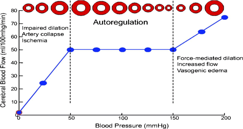 In healthy adults, CBF is autoregulated with respect to MAP between a MAP range of 50 to 150 mm Hg.